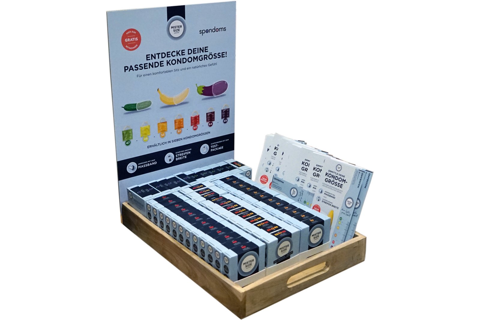 Peress li l-kondom jipprovdi protezzjoni xierqa biss jekk ma tiċritx jew ma jiżloqx, is-7 daqsijiet kollha MISTER SIZE huma rappreżentati fid-dispenser tal-kondoms. Hemm ukoll tejp tal-kejl Mister Size li bih tista' tkejjel malajr u faċilment liema daqs tal-kondom jaqbel l-aħjar. Min-naħa waħda, dan iżid is-sigurtà tal-kontraċezzjoni, u min-naħa l-oħra, il-kondoms huma aktar probabbli li jintlibsu jekk joqogħdu bil-kumdità.